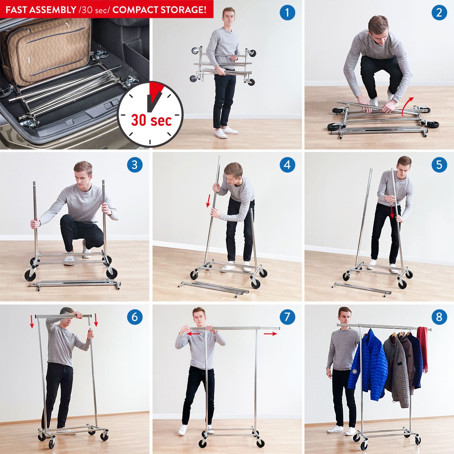- ✅ Facile da montare e riporre: non sono necessari strumenti particolari o lunghi processi di assemblaggio. Questo appendiabiti può essere installato in soli tre semplici passaggi entro 1 minuto (senza attrezzi). E quando non è in uso, puoi facilmente smontarlo per riporlo sotto il letto o in un angolo per risparmiare spazio